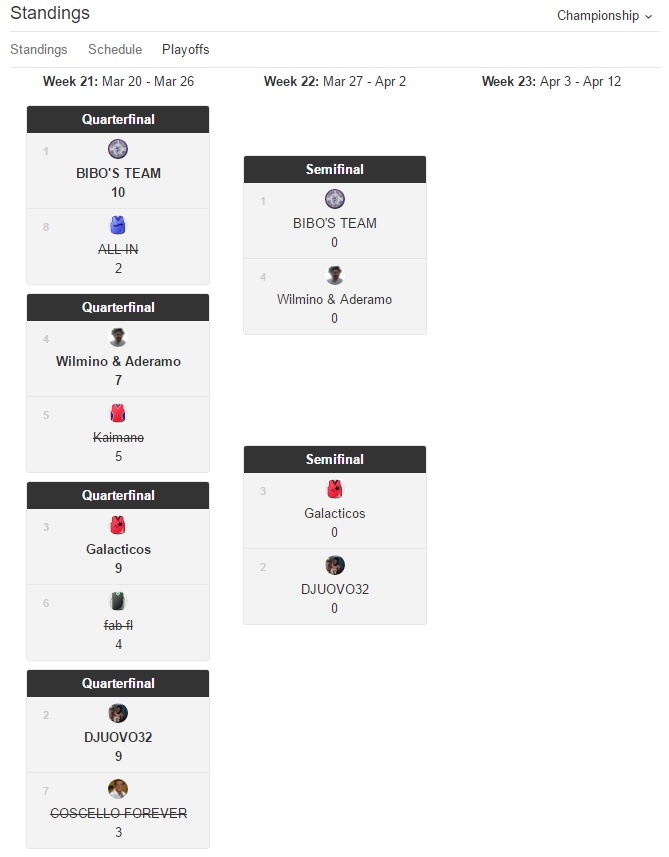 Prima playoffs passano al turno successivo Galacticos e Wilmino & Aderamo ,Bibo’s e DjUovo32