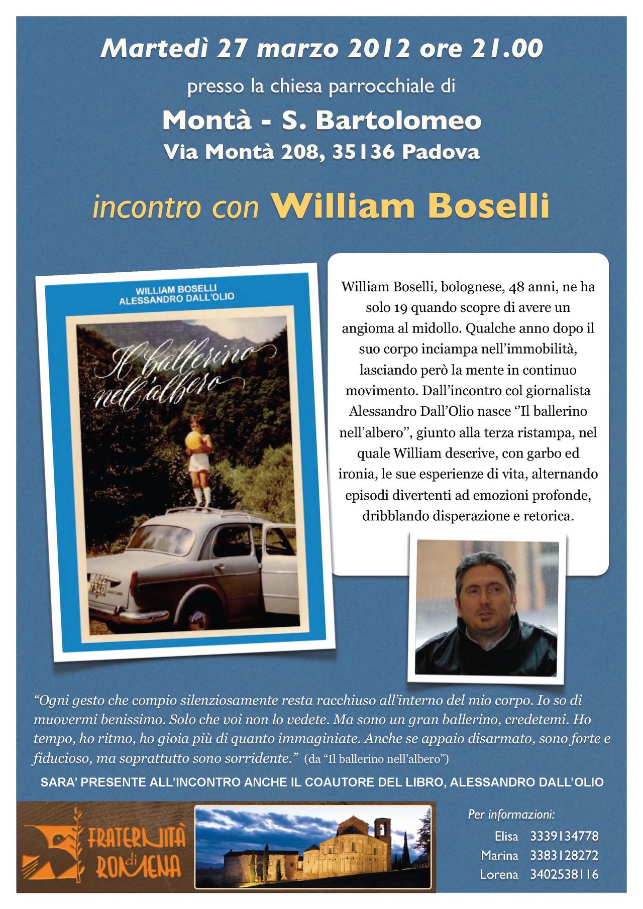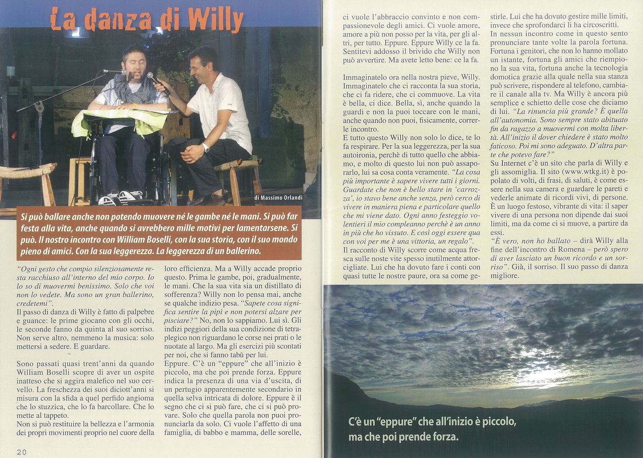 nell’immobilità, lasciando però la mente in continuo movimento. Dall’incontro col giornalista Alessandro Dall’Olio nasce “Il ballerino nell’albero”, giunto alla terza ristampa, nel quale William descrive, con garbo ed ironia, le sue esperienze di vita, alternando episodi divertenti ad emozioni profonde, dribblando disperazione e retorica.