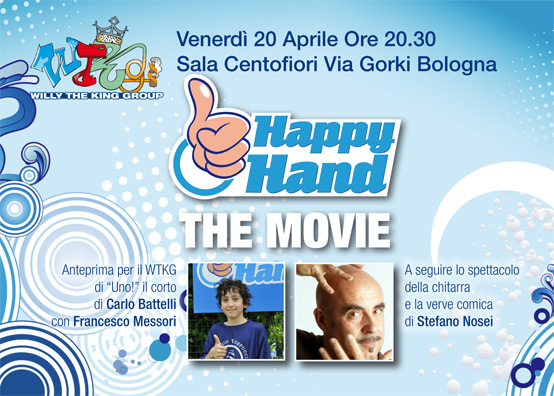 lungometraggio del regista-cestista Daniele Zampogna sulla manifestazione d’esordio di Happy Hand, lo scorso Giugno a Monte San Pietro. La proiezione si terrà alla Sala Centofiori di via Gorki 16 (capolinea 27A direzione Byron) venerdì 20 Aprile alle ore 20.30 e sarà preceduta da un altro evento significativo: la prima bolognese di “Uno!” il corto del regista modenese Carlo Battelli che ha per protagonista il nostro piccolo grande amico Francesco Messori. Anche Francesco, così come Bebe Vio (nominata tedofora alle Paralimpiadi di Londra) sarà nuovamente nostro ospite alla seconda edizione di Happy Hand che si svolgerà il primo week end di Giugno al Centro Sportivo “Filippetti” di Riale e al Centro Sportivo “Jesse Owens” di Ponte Rivabella. Concluderà la serata cinematografica del 20 Aprile un cameo live dell’eclettico Stefano Nosei, tra i più apprezzati e versatili artisti del cabaret italiano, nonché amico di Willy e del Wtkg.