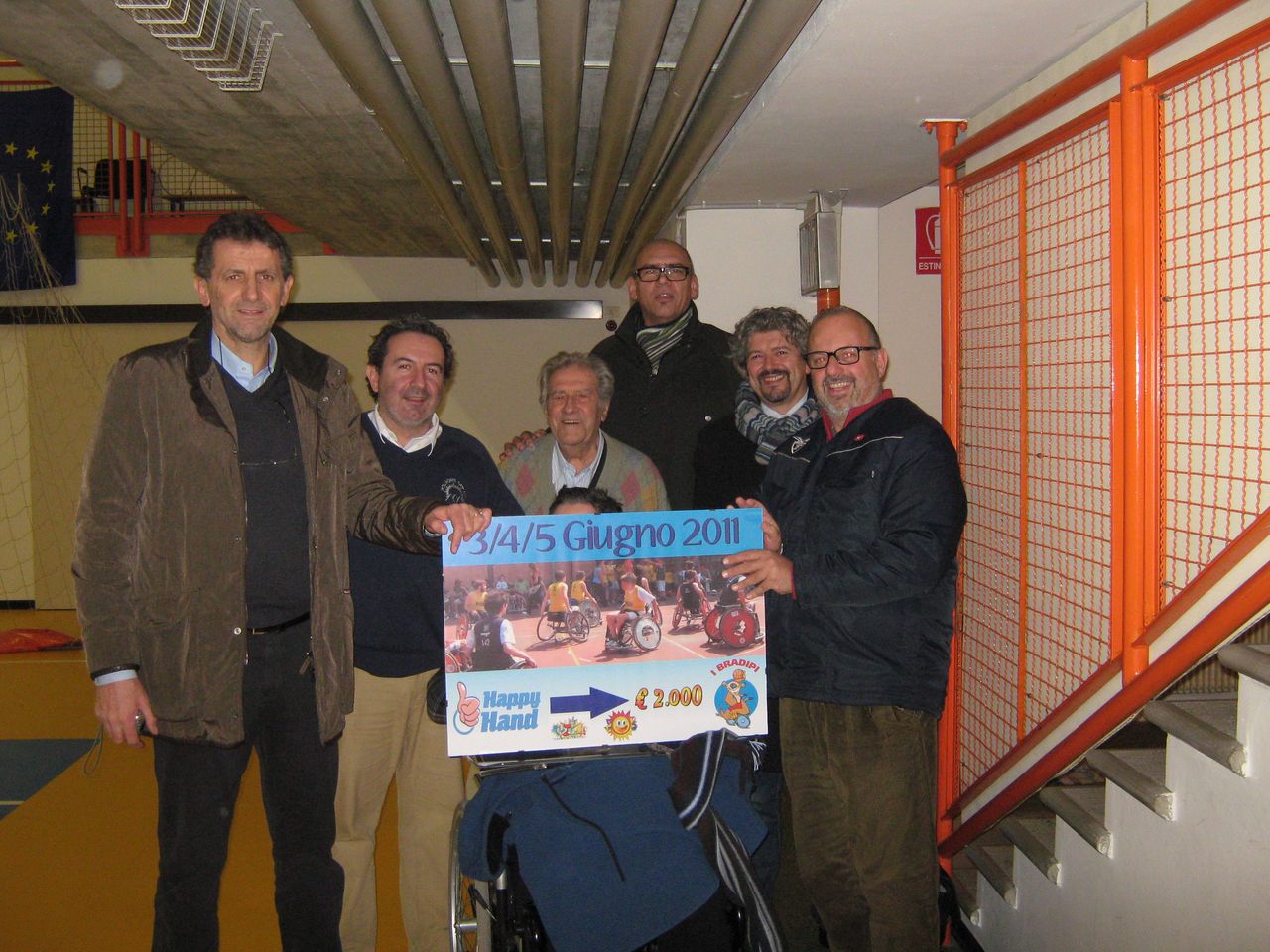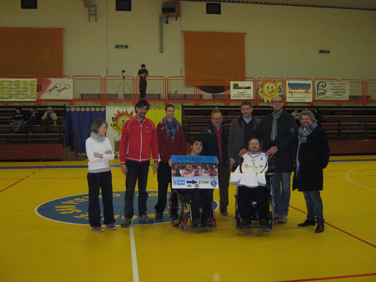 E’ stata una festa nella festa. In collaborazione con l’associazione Monte San Pietro con cui abbiamo organizzato Happy Hand, abbiamo voluto attribuire un riconoscimento e un grazie dal profondo del cuore ai Bradipi di Bologna, la società sportiva che fa minibasket in carrozzina e che in giugno è stata dei nostri a Happy Hand. Wtkg e Polisportiva Monte San Pietro hanno fatto ai Bradipi, rappredsentati da Germano Pepoli e dall’allenatrice Claudia Bedin, una donazione di 2000 euro, l’equivalente di una carrozzina da gara. La consegna dell’assegno e la rituale foto di gruppo, nella palestra Jesse Owens di Ponte Rivabella, è avvenuta la scorsa settimana durante l’incontro di campionato Promozione tra MSP e Montevenere. Il Wtkg era rappresentato dagli ex campioni Daniele, Nino ,Emanuele e Magu’. Grazie ragazzi e viva i Bradipi: ci avete fatto vivere un altro momento magico.
