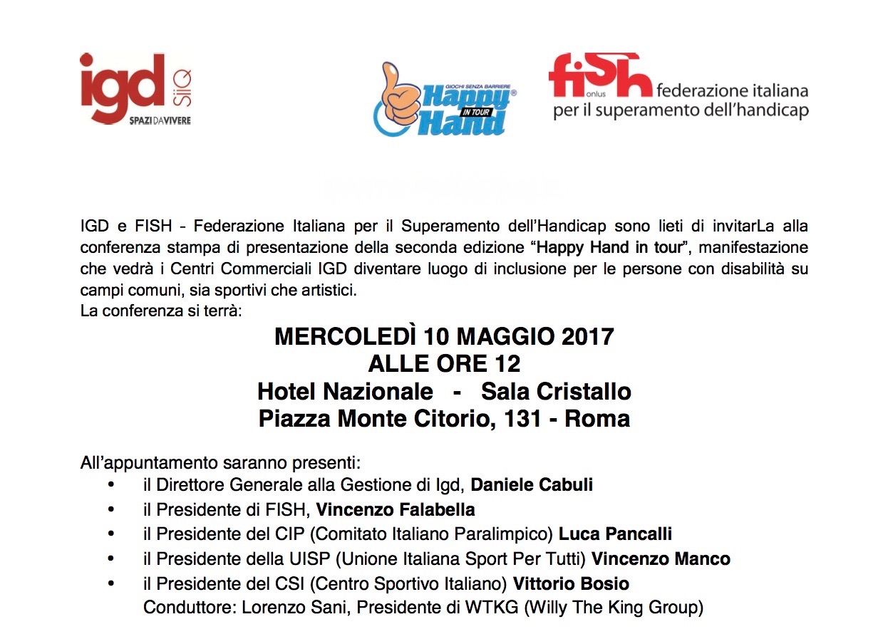 Un successo all’insegna della festa, delle performance musicali, artistiche e sportive, dell’incontro con il variegato popolo dei visitatori-fruitori dei Centri Commerciali».Ebbene, Happy Hand in Tour sta per “scaldare i motori” in vista di un nuovo giro d’Italia, con vecchi e nuovi partner, sempre nell’ambiente dei Centri Commerciali, scenario che consentirà ancora di avvicinare moltissime persone.Questo sarà possibile innanzitutto grazie alla Società Immobiliare Grande Distribuzione (IGD), uno dei principali player in Italia nel settore immobiliare della grande distribuzione organizzata, con quotazione in borsa, che sviluppa e gestisce Centri Commerciali su tutto il territorio nazionale. Al suo fianco, poi, vi saranno sempre la FISH, Federazione che raggruppa decine di Associazioni di persone con disabilità e delle loro famiglie e il CIP (Comitato Italiano Paralimpico), e anche l’Associazione WTKG (Willy the King Group), fondata da William “Willy” Boselli, persona con tetraplegia, definibile come un “veterano” di questo tipo di eventi, che negli anni scorsi aveva dato vita a un’iniziativa splendida quale Happy Hand – Giochi senza barriere, vero e proprio festival dello sport e della solidarietà, cui tra l’altro si è ispirato direttamente nel nome stesso il progetto Happy Hand in Tour.Ma anche nuovi partner, come detto, e non certo trascurabili, quali il CSI (Centro Sportivo Italiano) e l’UISP (Unione Italiana Sport per Tutti), vale a dire le due Associazioni che maggiormente favoriscono la promozione dell’attività sportiva in Italia.I vari eventi della nuova stagione 2017-2018 di Happy Hand in Tour – sui quali non mancheremo naturalmente di riferire – prenderanno il via esattamente il 10 e 11 giugno a Forlì, presso il Centro Commerciale Punta di Ferro, proseguendo poi il 24 e 25 giugno a Guidonia Montecelio (Roma), presso il Tiburtino Shopping Center, per protrasi quindi sino ai primi mesi del prossimo anno, con tante iniziative in programma in 24 Centri Commerciali del Lazio, dell’Emilia Romagna, della Toscana, della Lombardia, del Veneto, della Campania, della Sicilia, dell’Abruzzo e delle Marche.Il tutto è stato presentato oggi, 10 maggio, a Roma, nel corso di una conferenza stampa coordinata da Lorenzo Sani, presidente dell’Associazione WTKG, cui hanno partecipato il direttore generale alla Gestione di IGD Daniele Cabuli, il presidente nazionale della FISH Vincenzo Falabella, il presidente nazionale del CIP Luca Pancalli e il presidente nazionale dell’UISP Vincenzo Manco.