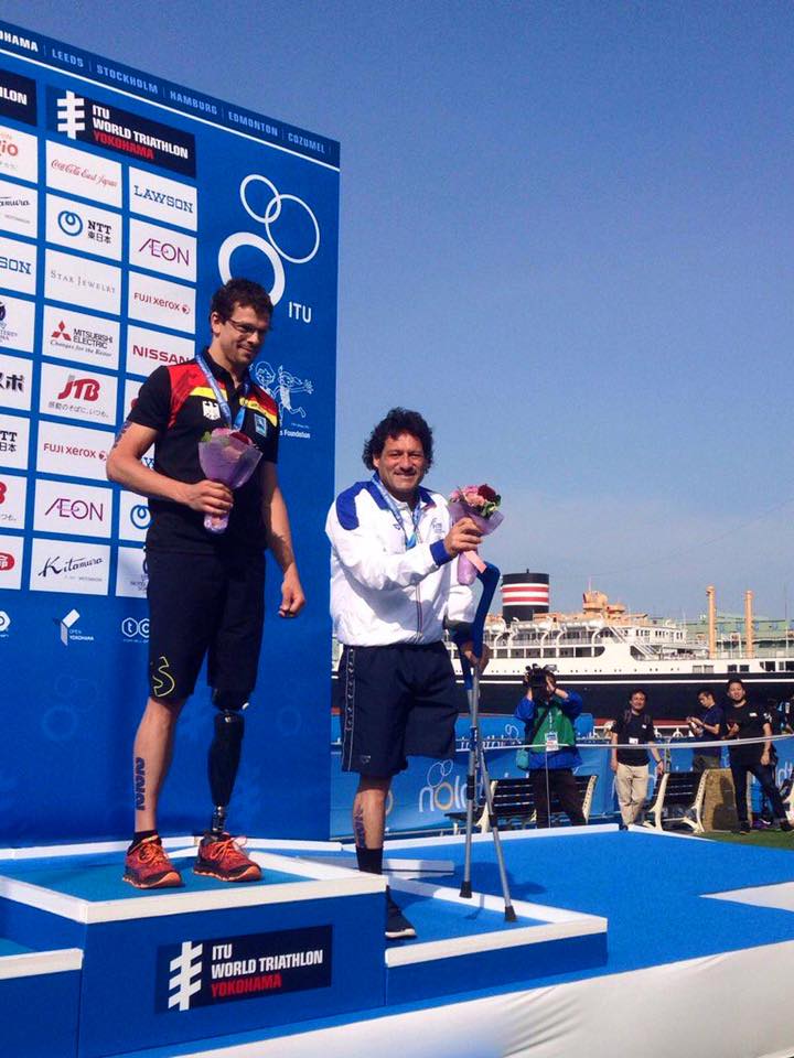 boa); 1’42” la transizione nuoto-bici (passaggio con le stampelle, togliere la muta, portare bici a mano fino all’uscita della zona cambio). 33’36” (con un po’ di fatica) il tempo per affrontare i 20Km di bici e 1’15” per la transizione bici-corsa (portare bici al suo posto, mettere protesi e scarpa da corsa). I 5Km di corsa sono stati fatti con un buon 24’51”. Per un totale di gara di 1h13’52”: terzo posto dietro Loesler (GER) e Garvey (AUS) arrivati in volata al traguardo 2 min. prima di Gianni. Da segnalare che l’australiano Garvey non si è presentato sul podio per protesta, forse amareggiato dalla sconfitta in volata. NOI INVECE FESTEGGIAMO UN BRONZO MERITATISSIMO!