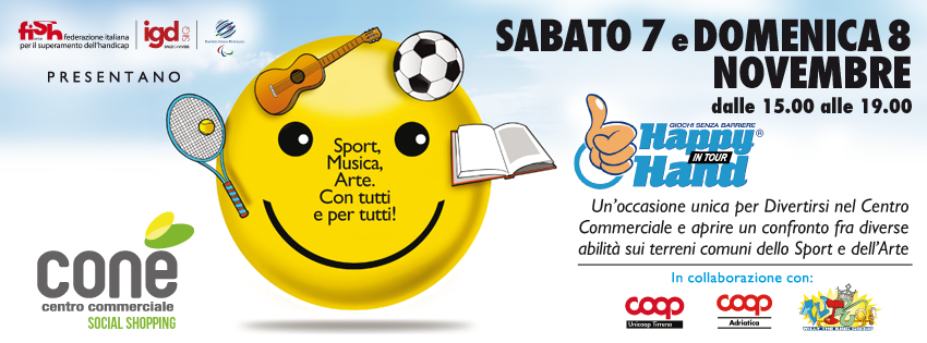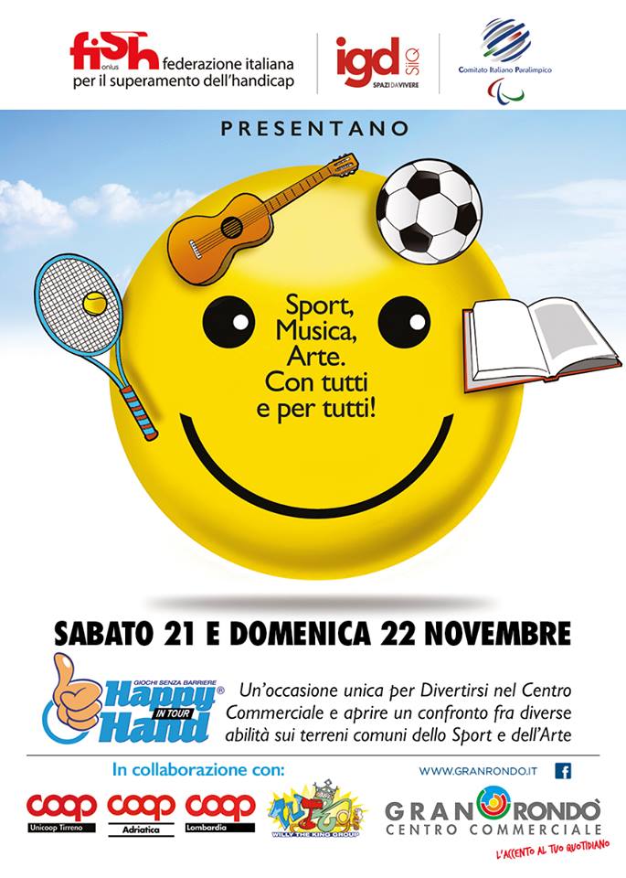 Proprio negli stessi giorni, infatti, in cui Rimini ospiterà il grande convegno dedicato alla “Qualità dell’integrazione scolastica e sociale”, arriverà al Centro Commerciale Malatesta della città romagnola anche il progetto “Happy hand in Tour”, promosso da IGD (Immobiliare Grande Distribuzione), insieme alla FISH (Federazione Italiana per il Superamento dell’Handicap), al CIP (Comitato Italiano Paralimpico), all’Associazione WTKG e a COOP, che diffonde una nuova cultura della disabilità, attraverso lo sport, la musica e l’espressione creativo-artistica