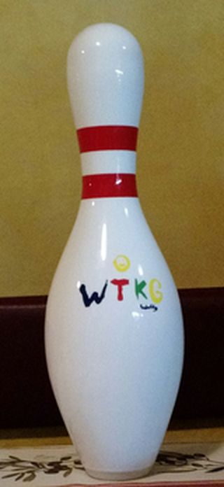 Roberto era un mio compagno di classe alle medie e per l’occasione mi ha regalato un birillo da bowling serigrafato wtkg.